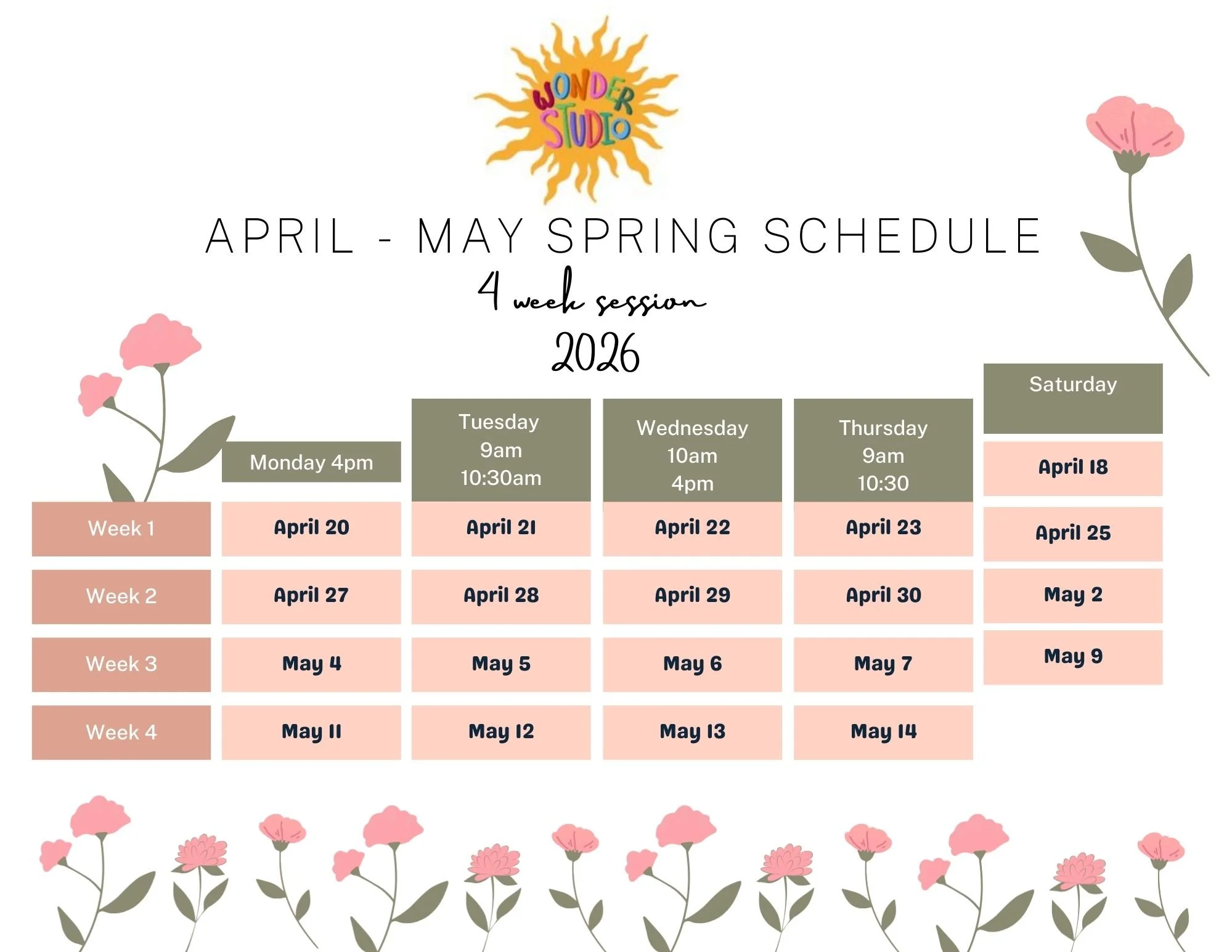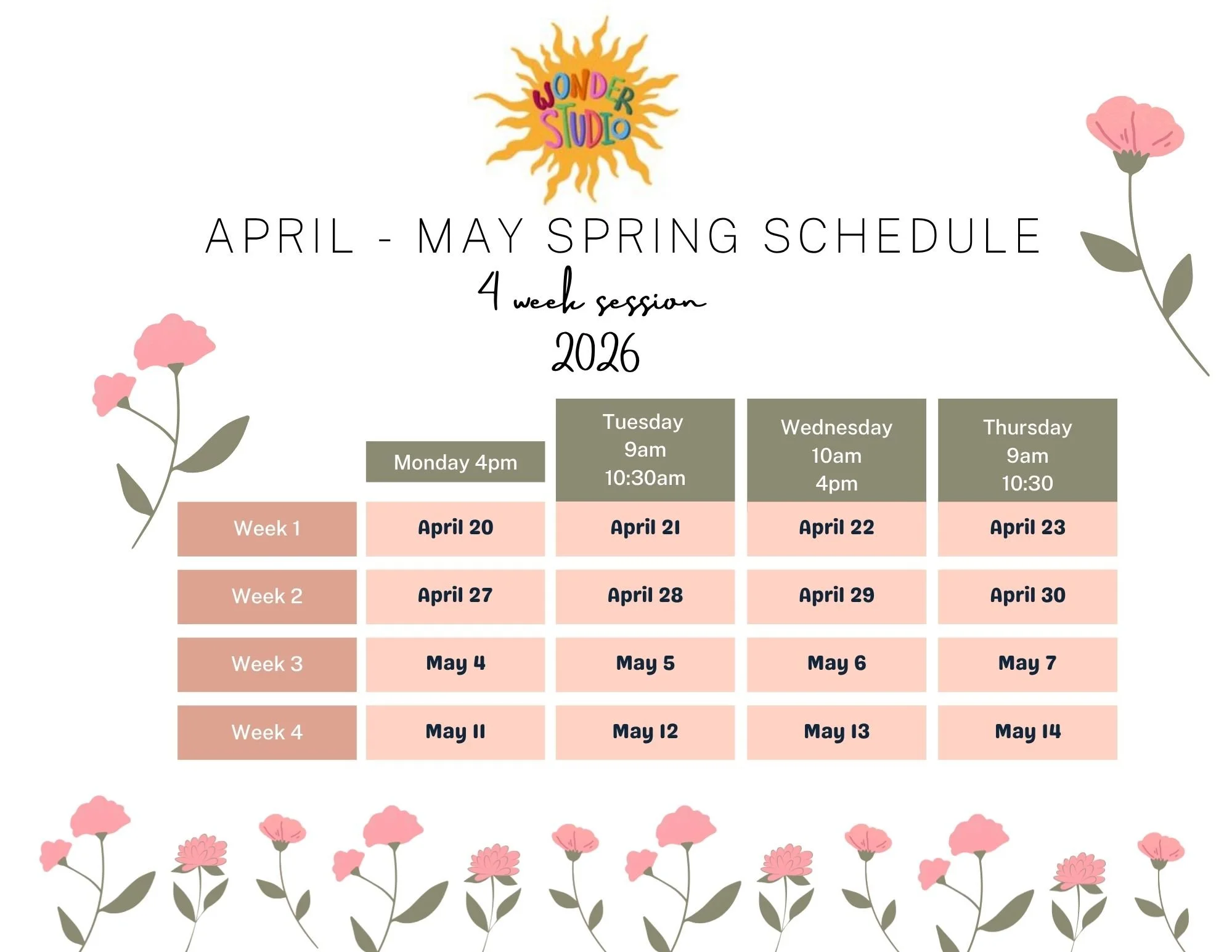 Wonder Studio Spring classes are 4 week sessions.